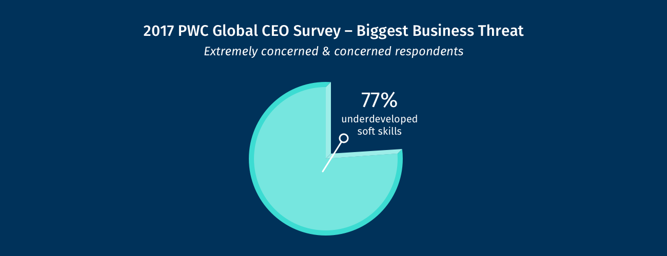 Both employers and employees are feeling the effects of the current demand over available supply of soft skills. Employers want their employees to have them, but they are decreasing in availability and capability levels. For several years running PWC’s global CEO survey has highlighted the negative impact of the increasing lack of soft skills. The concern is so great that 77% of respondents to PWC’s survey highlighted the lack of soft skills as the biggest threat to their business.