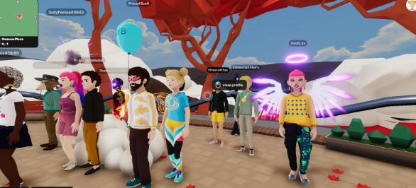 Creating my avatar was quite easy and fun to do. Soon I was bumbling around with a few others not really knowing where to go or what to do. Browsing the highlights gave me some direction, and from here I could “jump in” to a bar and grab a virtual beer (for over 21s only), get tickets to a virtual live concert from a Swiss pop star, attend a Ukrainian virtual art exhibit, listen to AI poetry, go to the “Petaverse” (!) or play a range of games.