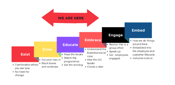 EMBED: When organizations are in EMBED, they incorporate DEI initiatives, goals, and accountabilities into the employee and customer lifecycle.
