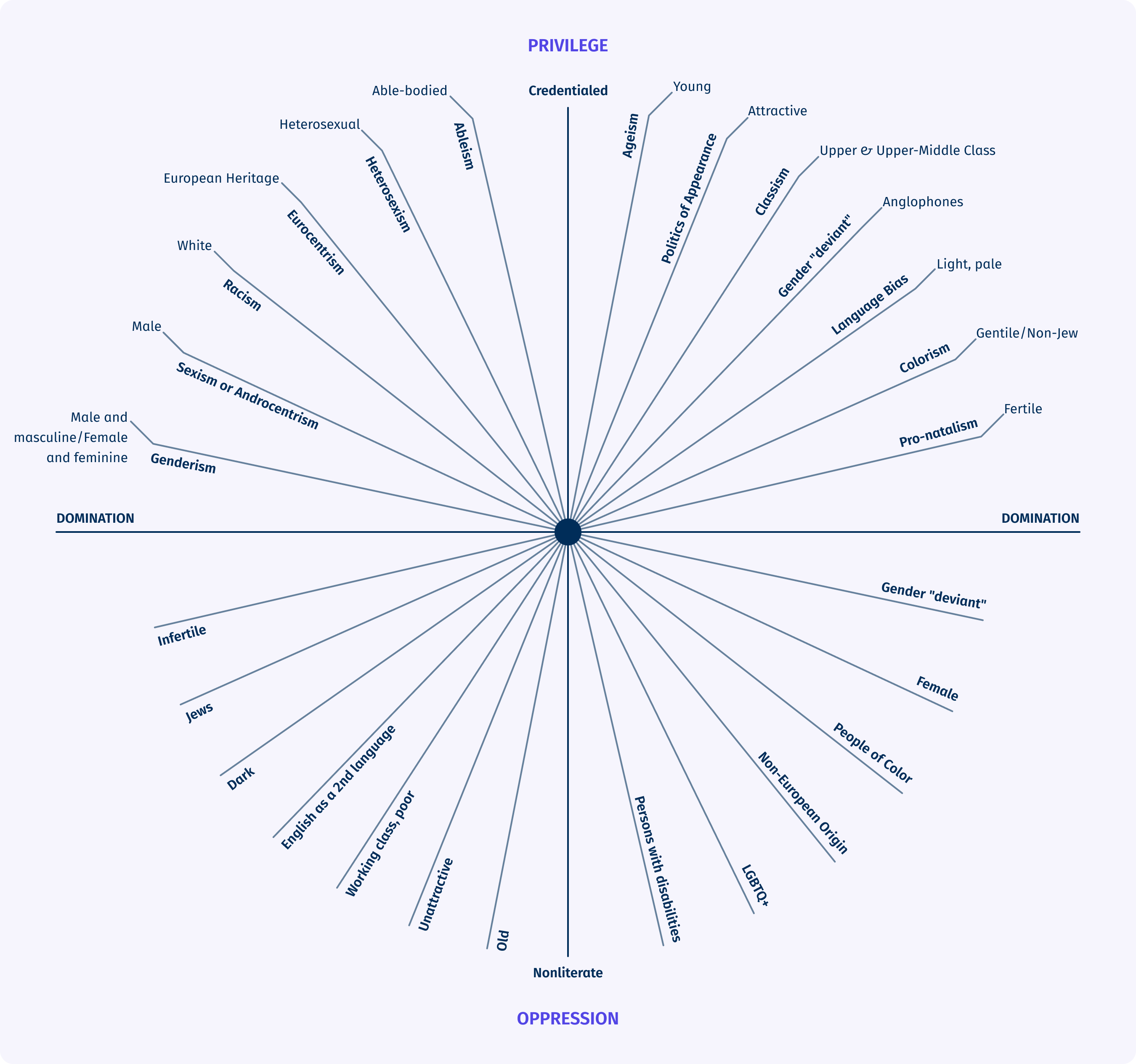 The below Intersecting Axes of Privilege, Domination, and Oppression diagram, which has been adapted from Kathryn Pauly Morgan’s model, shows what privilege means.