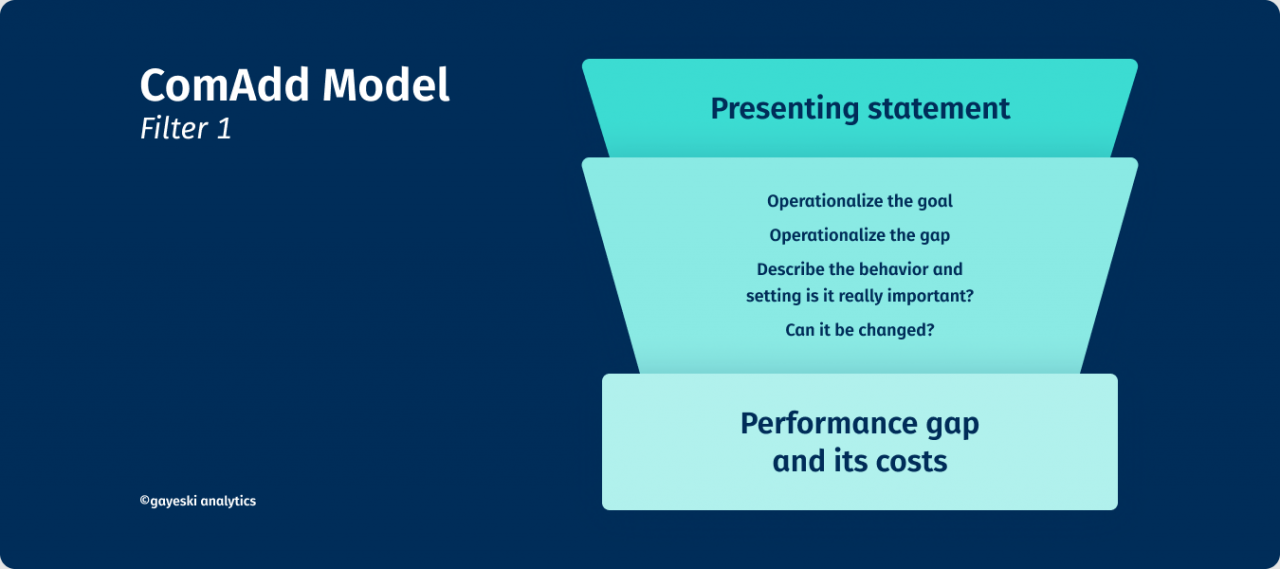 Think of the diagnostic process as a filter – you start out with a vague “presenting statement” from a client, and then try to ask questions that let you identify the performance gap and its cost to see if it’s worth pursuing.