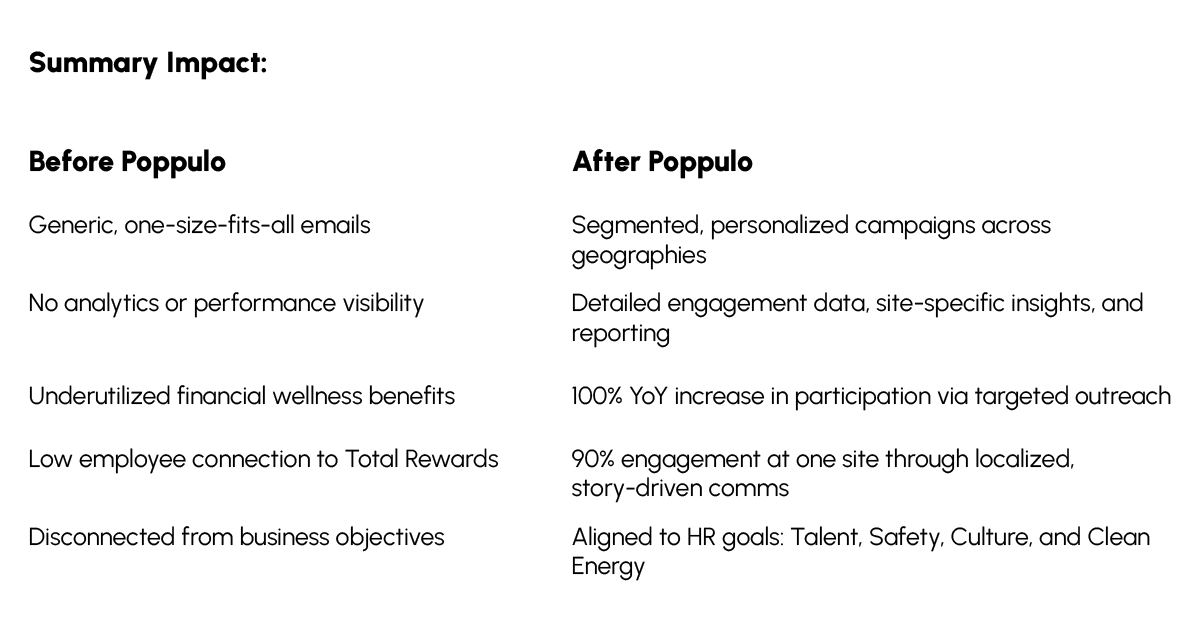 With Poppulo, CF Industries has turned HR communications into a core driver of business value. Whether it’s engaging employees with Total Rewards, elevating financial wellness programs, or building culture across borders, the combination of targeted messaging, real-time analytics, and authentic storytelling has proven transformational.