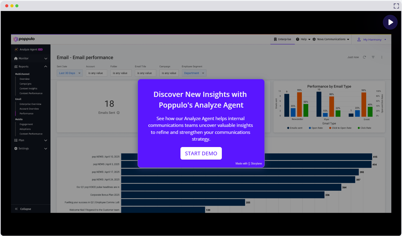 1. Analyze Agent—enables internal comms professionals to ask natural-language questions about their email data and quickly surface insights on engagement, performance, and audience behavior. They can also benchmark performance over time and across audiences or employee segments, identify which groups need re-engagement, and pinpoint optimal send times based on real behavioral patterns. The Analyze Agent also interprets signals such as likes and comments to gauge employee sentiment, and reviews message content itself—highlighting themes, keywords, length, media usage, and reading complexity—then links those factors back to engagement outcomes. The result is faster, deeper insight that helps organizations make more confident, data-driven communication decisions.