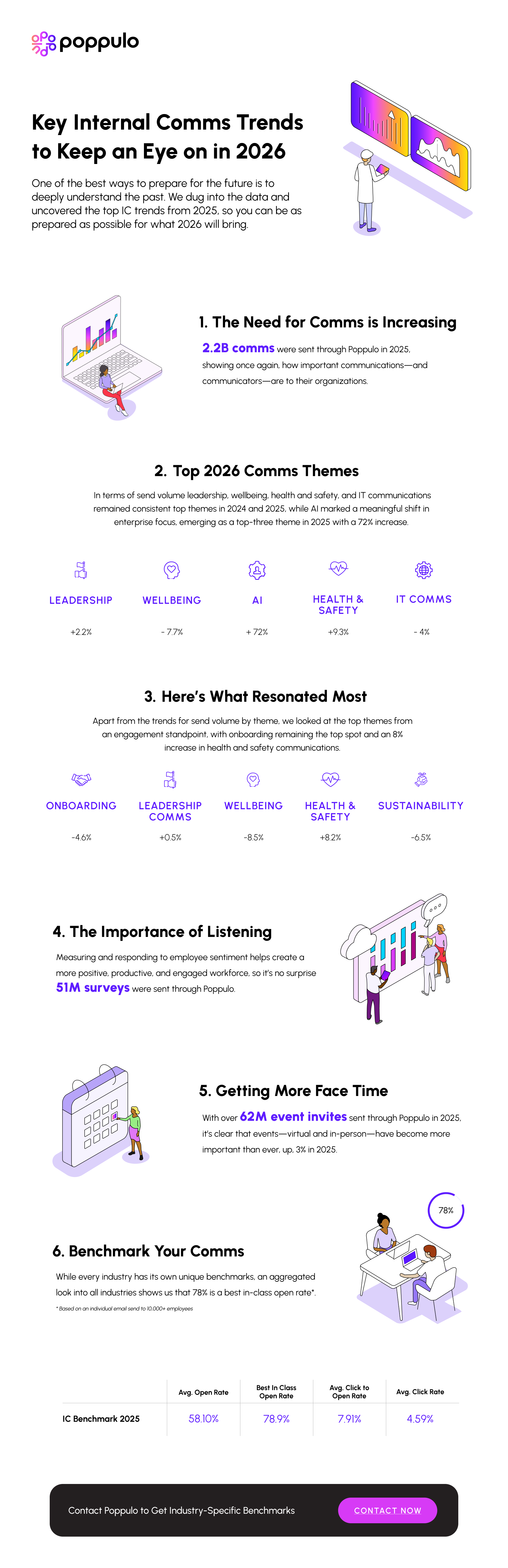 The infographic below breaks down the themes that shaped employee communications in 2025, how engagement varied across topics, and what current benchmarks reveal as organizations look ahead to 2026.